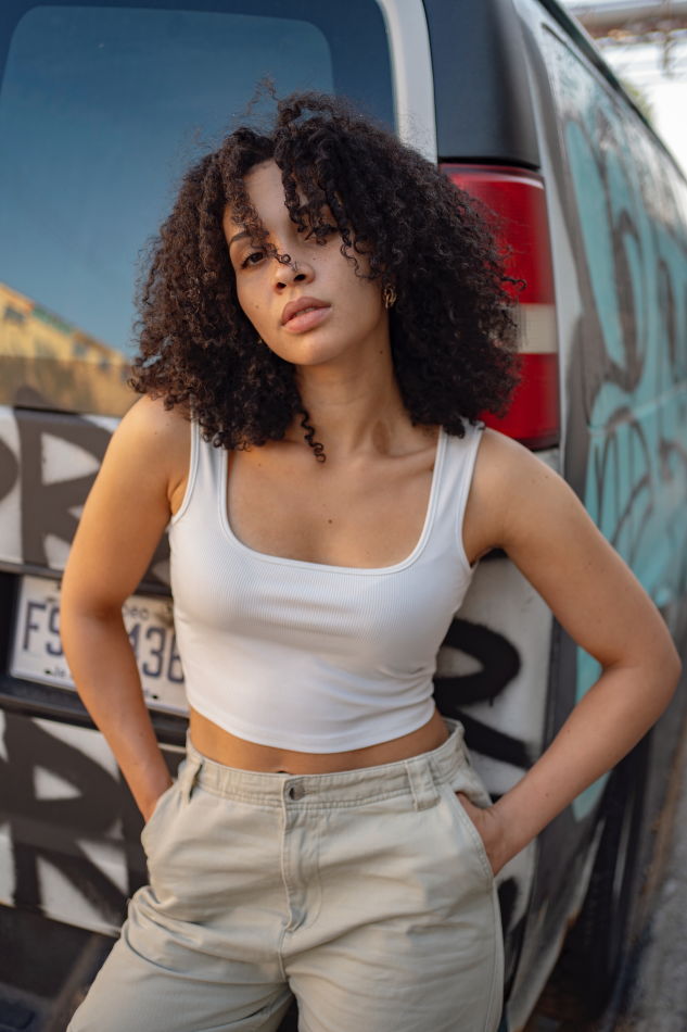 Estelle radiates a magnetic contrast — a vibrant softness full of spark, blended with a quiet strength. Influenced by chic streetwear and natural beauty, she embodies a modern, accessible, and authentic femininity. Her intense gaze and mixed heritage presence tell a story beyond borders. Driven by a love of challenge and transformation, she moves forward by exploring her own limits, always with grace.